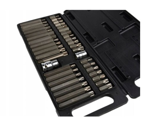Zestaw bitów wykonany ze stali CrV, służący do odkręcania śrub specjalnych typu: torx, spline, hex. Dzięki dużej różnorodności bitów zestaw ten doskonale sprawdzi się w profesjonalnych serwisach i warsztatach samochodowych.