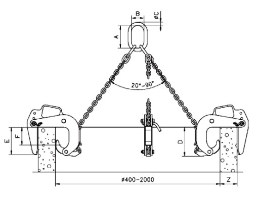- Model uchwytu dla kręgów betonowych zgodnych z DIN 4034 do średnicy kręgu 2 000 mm , dla większych średnic uchwyty dostępne na zamówienie .