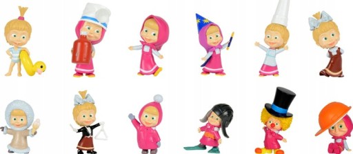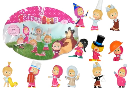 Figurka z odwzorowanymi postaciami Maszy w 12 różnych wcieleniach i strojach z lubianej przez dzieci bajki animowanej Masza i Niedźwiedź opowiadającej o przygodach dziewczynki Maszy i cyrkowego niedźwiedzia, którzy się zaprzyjaźnili i przeżywają razem niezwykłe przygody.