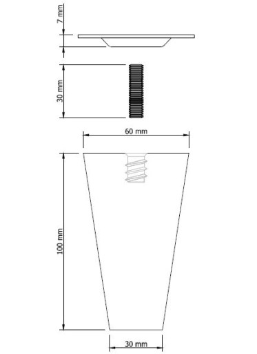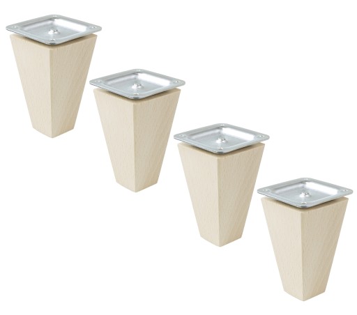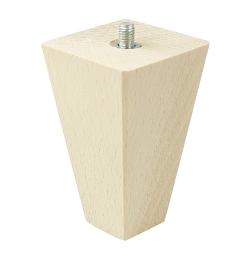 Noga bukowa - rozmiar 60 x 60 mm na górze, 30 x 30 mm na dole, kwadrat stożek 10 cm wysokości surowa. Wraz z nóżką otrzymują Państwo blachę montażową, która ułatwia montaż w meblu. Noga posiada wkręconą mufę M8 x 24 mm, do której wkrecamy szpilkę M8 x 30 mm oraz blachę montażową - znajdują się w zestawie. Do montażu blachy należy zastosować wkręty o rozmiarze 3,5 lub 4,0 do drewna - dostępne w naszej ofercie. Nóżkę można wg własnych potrzeb pomalować lakierem bezbarwnym lub wybarwić na dowolny kolor bejcą lub lakierem.