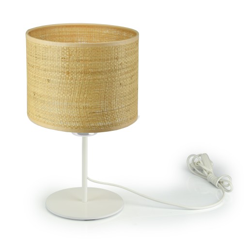 Designerska lampka nocna stołowa z rattanowym abażurem.