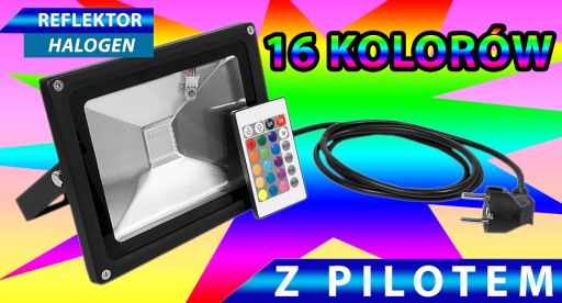 REFLEKTOR HALOGEN LED 20W RGB SMD 16 KOLORÓW Z PILOTEM + kabel zasilający 10m