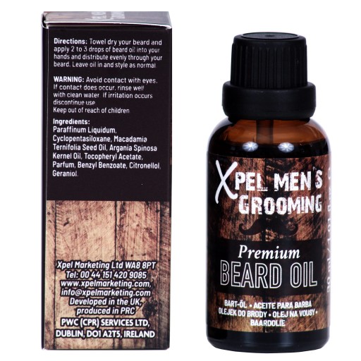 Xpel Men`s Grooming Premium Beard Oil 30ml to olejek do brody na bazie olejku z orzechu makadamia i oleju arganowego. Użyj 2-3 krople na uprzednio osuszoną ręcznikiem brodę. Rozprowadź równomiernie, nie spłukuj.