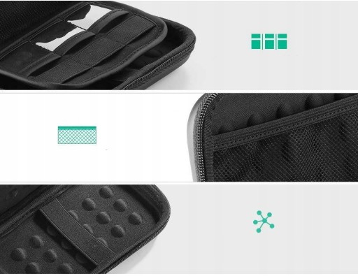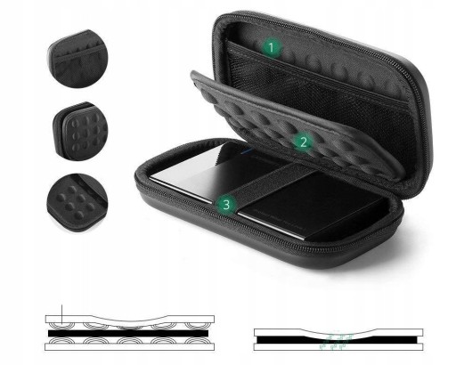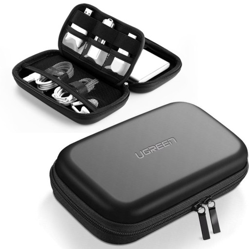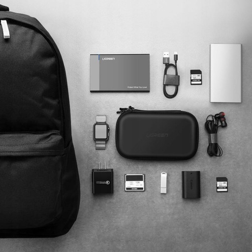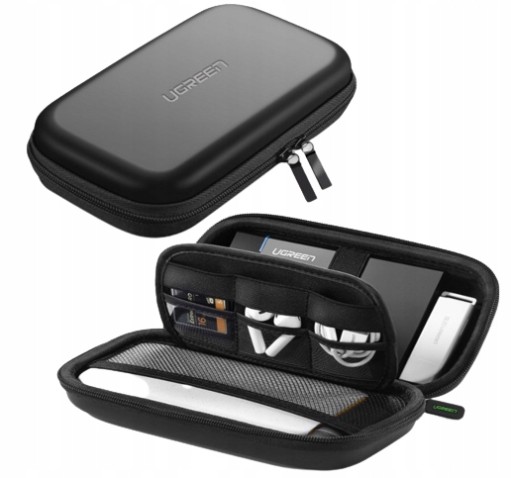 Etui firmy UGREEN, w którym zmieścimy dysk twardy SSD, a także różne akcesoria, takie jak: ładowarka sieciowa, kabel USB, pendrive, karty pamięci, adaptery, itp. Wykonane z trwałego materiału EVA. Jest wodoodporne i kompaktowych rozmiarów, co sprawia, że możemy je zabrać w każdą podróż.