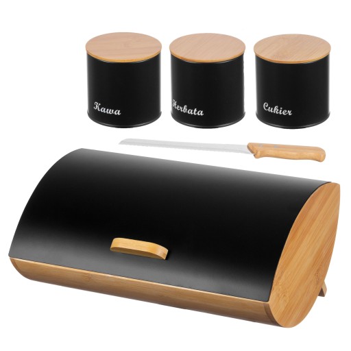 - Chlebak oraz pojemniki na cukier, kawę i herbatę wykonane z trwałych materiałów (stal węglowa oraz włókno bambusowe)