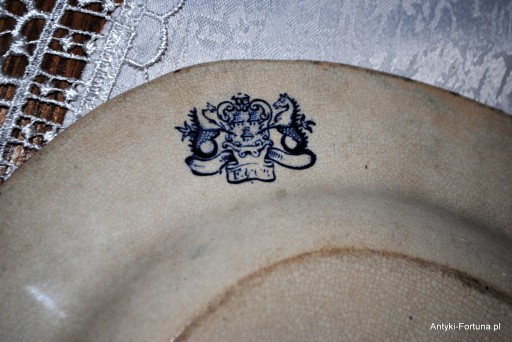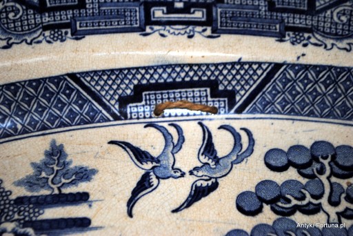 Stary półmisek o wymiarach 32x26 cm w kobaltowym kolorze -- Blue - ze znanej i cenionej manufaktury angielskiej Staffordshire Fell & Co. , rok ok 1840 . Stan jak na zdjęciach - 2 małe otworki - półmisek wisiał jako ozdobny talerz na ścianie.