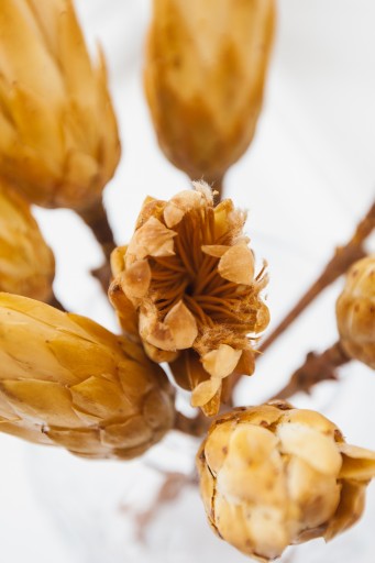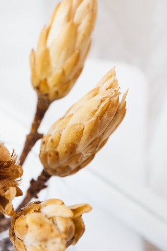 Naturalnie suszona PROTEA preparowana w glicerynie znana inaczej jako Kwiat Prometeusza i Srebrnik. Płatki są sztywne, ułożone dachówkowato, łodyga zdrewniała. Kwiat został zasuszony w fazie pąka.