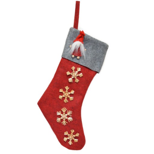 OPIS: Zestaw zawiera: Wykrojone elementy skarpety - należy je zszyć. filcową czerwoną skarpetę do zawieszenia, szary kawałek materiału, elementy do wykonania skrzata 4 słomkowe śnieżynki. wysokość wykrojonej skarpety mierzona od pięty - 36 cm szerokość wykrojonej skarpety - 17 cm Zestaw nie zawiera kleju.