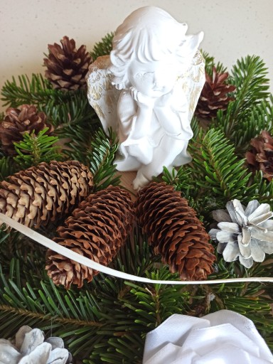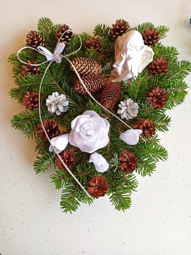 Wieniec naturalny wykonany jest na podkladzie serca z drzewa i gałązek żywej jodły. Na wianku znajduje się piękny biały, z pozłacanymi skrzydłami, gipsowy aniołek o wymiarach 11 cm na 9cm. Ozdobiony szyszkami sosny i świerka. Dodatkowo białymi różami wykonanymi ręcznie ze wstążki satynowej.