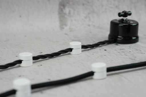 Uchwyty montuje się bardzo prosto, składają się z dwóch elementów: korpusu, który przykręcamy do ściany, sufitu lub gdziekolwiek oraz nakładki dociskającej. Przykręcamy korpus za pomocą kołka znajdującego się w zestawie, kładziemy przewód i zakrywamy kapslem