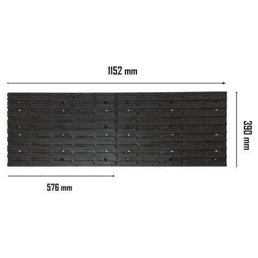 - Zestaw uchwytów do narzędzi (20 sztuk), 2 tablice ścienne 57,6 cm x 39 cm (po złączeniu 115 cm x 39 cm), oraz 3 półki.