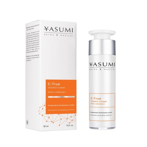 Intensywnie rozjaśniający krem przeznaczony do pielęgnacji skóry z przebarwieniami, nierównym kolorytem oraz skłonnej do zmian barwnikowych. Zapobiega powstawaniu plam pigmentacyjnych oraz złuszcza i rozjaśnia istniejące przebarwienia. Czysta witamina C (1%) rozjaśnia i likwiduje przebarwienia. SAP (1%) oraz enkapsulowana witamina C (6%), jako silne reduktory, przeciwdziałają procesowi utleniania wywołanemu przez wolne rodniki, hamują proces starzenia i działają przeciwzmarszczkowo. Kwas hialuronowy wysoko- i niskocząsteczkowy zapobiega przesuszeniu skóry. Organiczny krzem wzmacnia strukturę kolagenu oraz utrzymuje prawidłowy poziom nawilżenia skóry. Regularne stosowanie YASUMI C-True Vitamin Cream redukuje zmiany barwnikowe, przez co stają się mniej widoczne, a skóra twarzy odzyskuje zdrowy wygląd i równomierny koloryt.