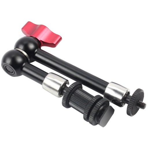Magic ARM to narzędzie o wielu zastosowaniach. Do pełnej funkcjonalności warto dokupić zacisk dostępny w naszej ofercie. Nasze ramię jest lepsze od konkurencyjnych ze względu na częściowo stalową konstrukcję. Dzięki tej różnicy nasze ramię jest o wiele bardziej wytrzymałe i stabilniejsze od w pełni aluminiowego. Wolniej się zużywa i wytrzymuje większe obciążenia. Optymalny wymiar 11" czyli około 27,5 cm umożliwia duże możliwości konfiguracyjne. Idealnie sprawdzi się jako pomoc do montażu: kamery, aparatu, telefonu, lampy błyskowej czy nawet małego monitora. W zestawie znajduje się śruba montażowa 1/4" czyli uniwersalnym standardzie fotograficznym. Nasze ramię wyposażone tez jest w adapter gorącej stopki. W zestawie znajduje się 1x ramię. Inne elementy mają ukazać jedynie przykładowe zastosowanie.