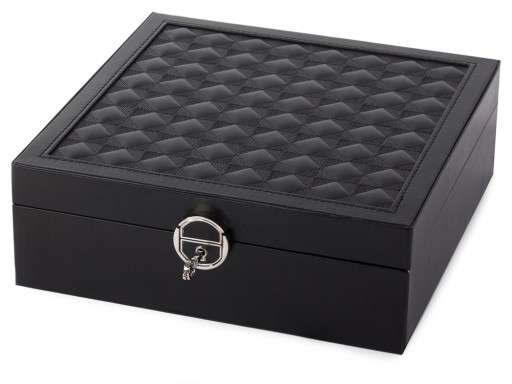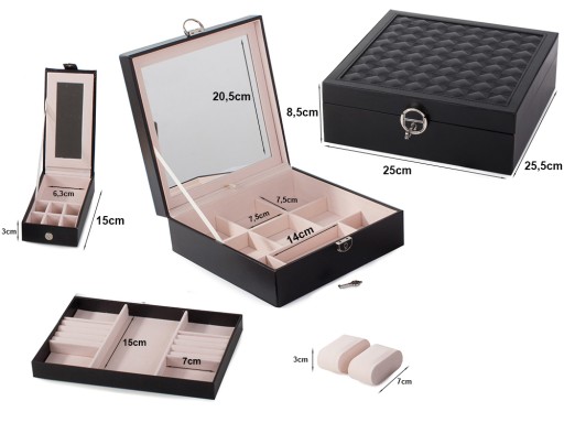 Duża, bardzo pojemna szkatułka, pozwoli na uporządkowanie wszelkiego rodzaju biżuterii oraz zegarków. Organizer wyposażony jest w różnego rodzaju oraz wielkości przegródek, które z powodzeniem pomieszczą dużą ilość pierścionków, łańcuszków, kolczyków, bransoletek i itp.