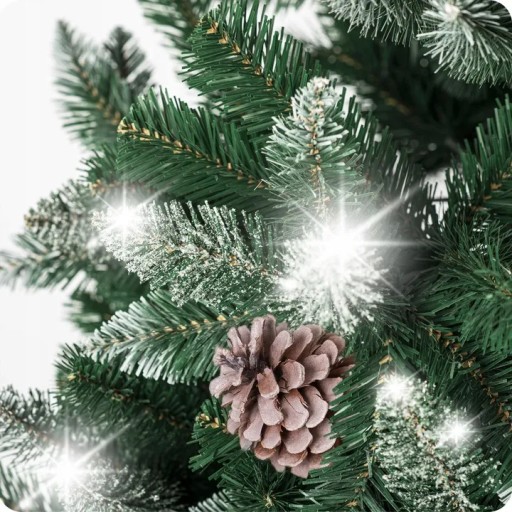 Przepiękna, naturalnie wyglądająca choinka. Ozdobiona szyszkami, osadzona na solidnej podstawie oraz naturalnym pniu sosnowym.