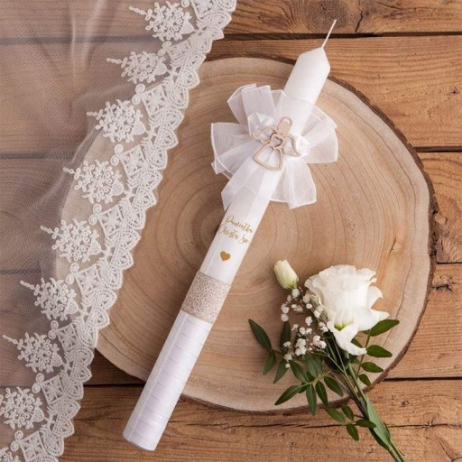 - skład: świeca do Chrztu ręcznie dekorowana satynową białą wstążeczką oraz koronkowymi wstawkami, a także efektownym tiulowym stroikiem oraz drewnianym aniołkiem z sercem, na świecy znajduje się naklejka z motywem serduszka w złotym matowym odcieniu i napisem Pamiątka Chrztu Św.