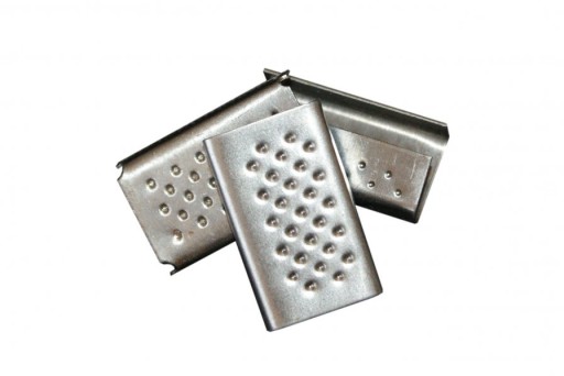 Zapinka blaszana jest zagniatana na taśmie dzięki czemu taśma jest trwale połączona a porowata powierzchnia na zapince dodatkowo zabezpiecza taśmę przed wysunięciem.