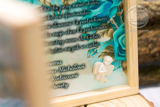 Dedykacja dla odbiorców w prawej części pudełeczka, wraz z przyklejonym gipsowym białym aniołkiem, podkreślającym te wyjątkową uroczystość.