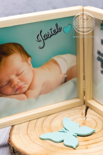 Drewniane pudełko składające się z unikatowej autorskiej grafiki, wraz ze zdjęciem dziecka chrzczonego oraz aniołka gipsowego naklejonego wewnątrz skrzyneczki.