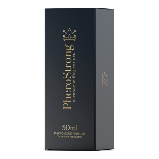 Perfumy z feromonami PheroStrong King w szklanej buteleczce o pojemności 50ml z atomizerem. Buteleczka zapakowana jest w stylowy kartonik producenta.