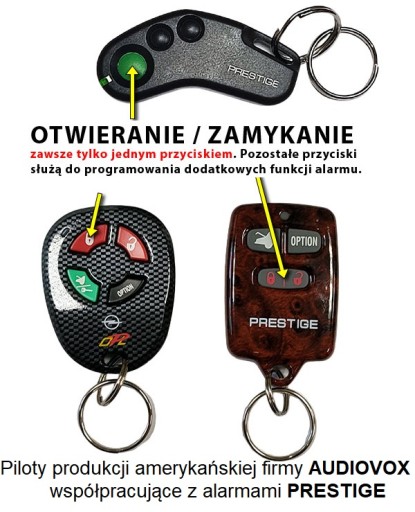 Alarmy PRESTIGE realizowały otwarcie i zamknięcie zamka centralnego w aucie przy pomocy jednego przycisku.