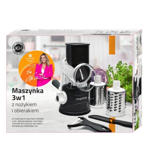 Szatkownica do warzyw z nożykiem i obieraczką Konighoffer 3w1 to możliwość błyskawicznego przygotowania warzyw i owoców do obróbki, a następnie rozdrobnienia ich na trzy sposoby (trzy bębny do cięcia na grube i drobne wiórki oraz na paski). Cały zestaw pozwoli przyspieszyć pracę w kuchni i w kilka minut przygotować warzywa i owoce do surówek, ciast czy na placki. Wykonanie z odpornego tworzywa sztucznego i stali nierdzewnej to gwarancja długotrwałego używania maszynki. Produkt ma rekomendację Ewy Wachowicz. Jako ambasadorka marki Konighoffer, gorąco i z uśmiechem poleca go ona do domowego użytku. Razem z nim zdobędziesz twój przepis na dom. To jedna z najlepszych opcji w tej kategorii!