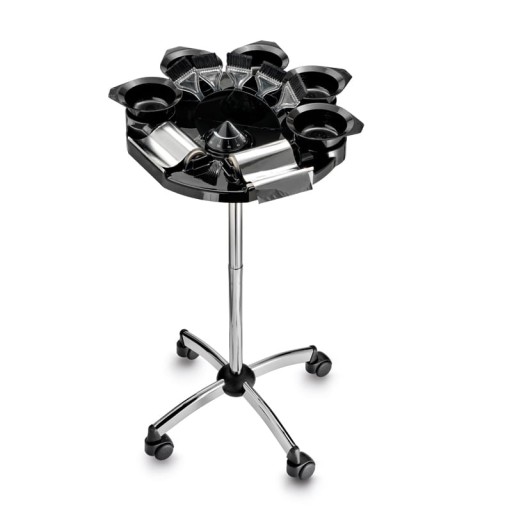 Pomocnik do koloryzacji TINTO to niezastąpiony sprzęt dla każdego fryzjera. Posiada on 5 miejsc na miseczki do farbowania oraz uchwyt na pędzelki. Ponadto wyposażony jest w specjalne uchwyty do folii aluminiowej. Pomocnik w kolorze czarnym.