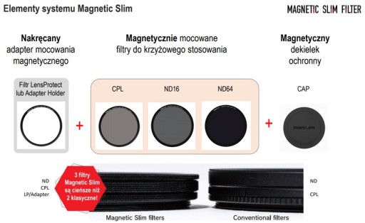 W systemie Marumi Magnetic Slim znajdziesz różne rodzaje okrągłych filtrów optycznych: ochronne, polaryzacyjne, szare oraz dekielki. Magnetyczne mocowanie zapewnia komfortowe i szybkie korzystanie z filtrów. Najpierw przykręcasz do gwintu obiektywu filtr ochronny, który jest jednocześnie magnetycznym adapterem, a później dokładasz do niego inne filtry z systemu dla uzyskania różnych efektów. Uwaga – możesz je ze sobą łączyć i używać kilku na raz!