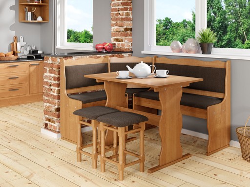 Zestaw ten może zostać ustawiony w niewykorzystanym rogu kuchni, będąc wygodnym miejscem do siedzenia. Doskonale prezentuje się zarówno w niewielkich, jaki i dużych pomieszczeniach, urządzonych w stylu klasycznym bądź nowoczesnym. Narożnik kuchenny posiada dwa pojemne schowki pod siedziskami, dając dodatkowe miejsce do przechowywania drobnych rzeczy. Wygodne taborety posłużą jako dodatkowe miejsce do siedzenia, które możesz dowolnie przestawiać według własnych upodobań. Stół wchodzący w skład zestawu nie jest rozkładany – jest lekki, poręczny i funkcjonalny. Całość wykonana została z wytrzymałych i trwałych komponentów, które zapewnią długoletnie użytkowanie.