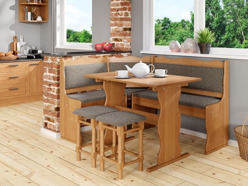 Zestaw ten może zostać ustawiony w niewykorzystanym rogu kuchni, będąc wygodnym miejscem do siedzenia. Doskonale prezentuje się zarówno w niewielkich, jaki i dużych pomieszczeniach, urządzonych w stylu klasycznym bądź nowoczesnym. Narożnik kuchenny posiada dwa pojemne schowki pod siedziskami, dając dodatkowe miejsce do przechowywania drobnych rzeczy. Wygodne taborety posłużą jako dodatkowe miejsce do siedzenia, które możesz dowolnie przestawiać według własnych upodobań. Stół wchodzący w skład zestawu nie jest rozkładany – jest lekki, poręczny i funkcjonalny. Całość wykonana została z wytrzymałych i trwałych komponentów, które zapewnią długoletnie użytkowanie.