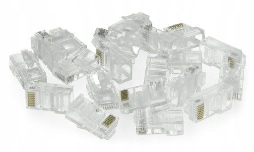 Ośmiostykowe złącza sieciowe Rj45 wykonane w systemie Pass Through. Używane do zakończenia przewodów typu "skrętka" w instalacjach sieci komputerowych. Gwarantują dużo lepsze i precyzyjniejsze zaciśnięcie niż tradycyjne wtyczki.