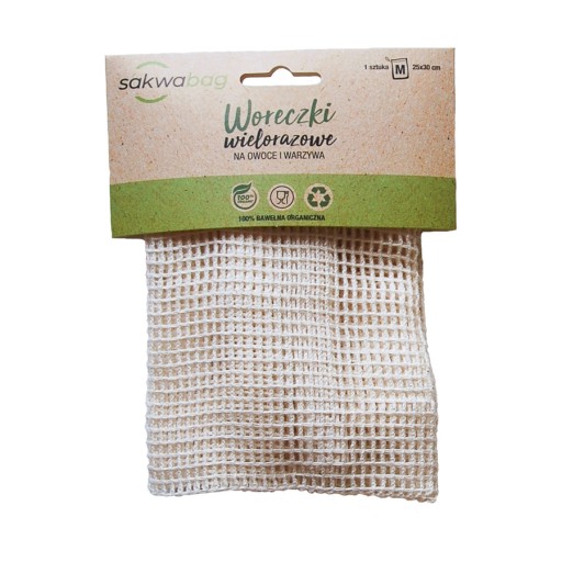 Wielorazowy woreczek na owoce i warzywa, wykonany w 100% z bawełny organicznej w rozmiarze M. Wymiar woreczka 25x30 cm. Woreczek pomieści około 2,5 kg produktów. Przedmiot wielokrotnego użytku, biodegradowalny. Produkt dopuszczony do kontaktu z żywnością przez Państwową Inspekcję Sanitarną.