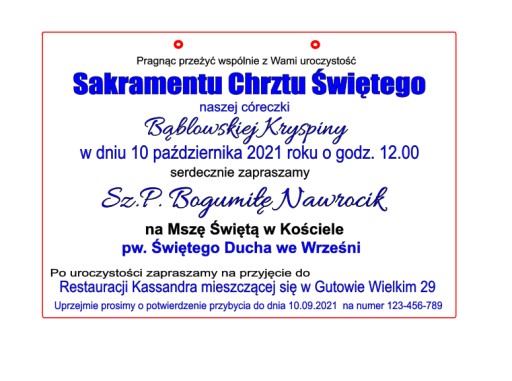 Zaznaczamy iż w przypadku bardzo długich nazw, imion czy nazwisk, wzór zaproszenia może ulec korekcie poprzez zmianę wielkości czcionki, tak aby była możliwość zmieszczenia danego napisu i dopasowania go do wielkości zaproszenia przy równoczesnym zachowaniu jego czytelności