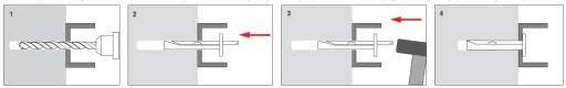 - Do wywierconego otworu wprowadzana jest kotwa, a trzpień jest wbijany aż do momentu jego pełnego zagłębienia się w korpusie.