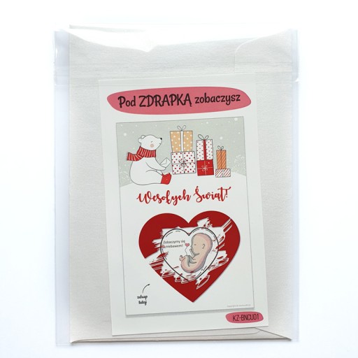 Kartka zapakowana w woreczek celofanowy, na odwrocie znajduje się ulotka z informacją co ukryte zostało pod zdrapką.