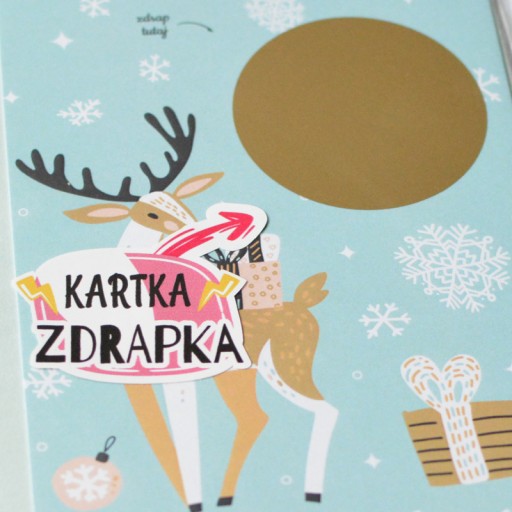 Kartka zapakowana w woreczek celofanowy, na odwrocie znajduje się ulotka z informacją co ukryte zostało pod zdrapką.