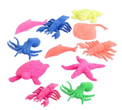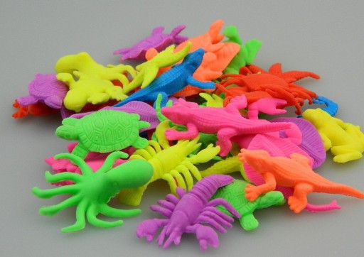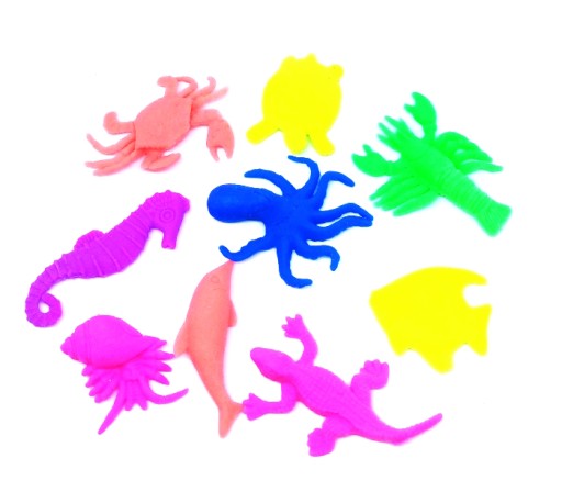 Gumowe kolorowe zwierzątka zmieniają swoją objętość po zanurzeniu ich w wodzie. Po kilku godzinach w wodzie zwierzątko zmienia swoje wymiary.
