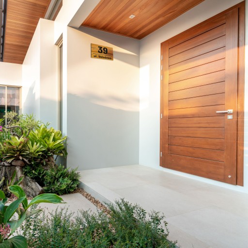 Tabliczka/adresówka z numerem na dom oraz z nazwą ulicy lub miejscowości.