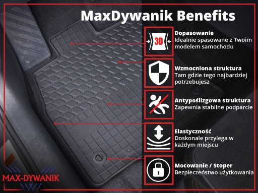 Zestaw stworzony przez firmę MAX-DYWANIK® składający się z dedykowanych dywaników gumowych oraz uniwersalnej osłony na tunel środkowy polskiej firmy MOTOHOBBY