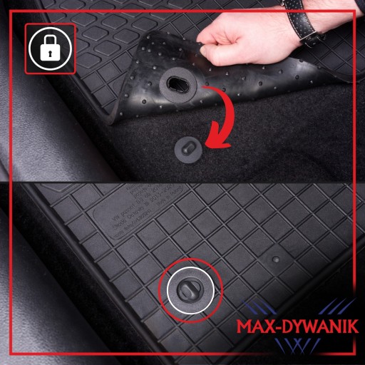 Nasze dywaniki samochodowe dostarczane są zawsze z zestawem mocującym, dopasowanym do danej marki/modelu samochodu (mocowania zamontowane są już oryginalnie na dywanikach i przystosowane pod oryginalne uchwyty występujące fabrycznie w podłodze samochodu). Dywanik kierowcy musi zawsze być mocowany do podłogi, podczas gdy możliwość mocowania dywaników pasażerów (z przodu i z tyłu) uzależniona jest od zaprojektowania takiego rozwiązania przez producenta danej marki samochodu.