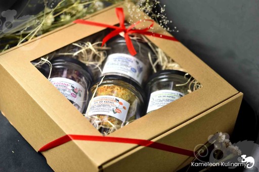 Zapakowane w elegancki kartonik z okienkiem, wypełniony eko-siankiem, przewiązany czerwoną kokardką.