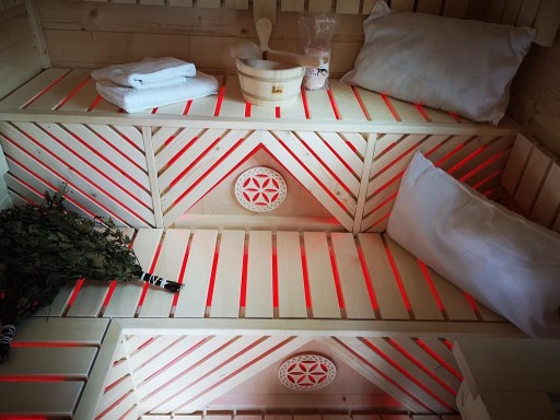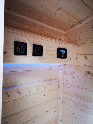 -oświetlenie RGB umiejscowione pod ławami + sterownik w przebieralni osobne sterowanie sauną osobne przebieralnią
