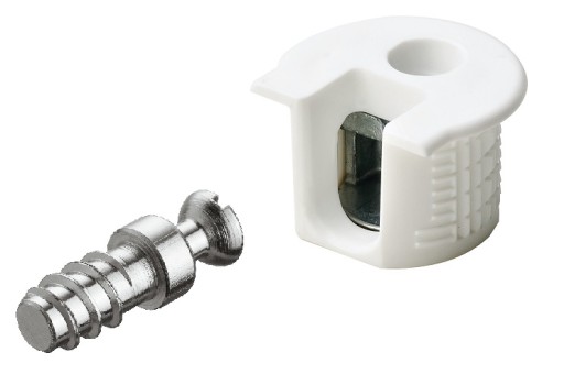 Tutaj kupujesz 50 x oryginalne złącze mimośrodowe Rafix 20 marki Hafele o średnicy 20 mm i głębokości 14 mm + do tego trzpień L11mm z gwintem do otworu o średnicy 5 mm.