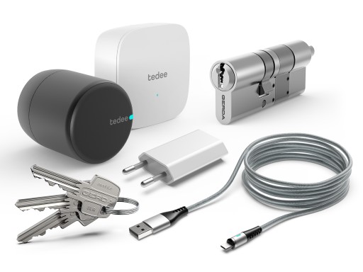 Zestaw tedee oprócz samego zamka, wkładki i bramki typu bridge zawiera również wszystkie elementy potrzebne do instalacji i korzystania z zamka: