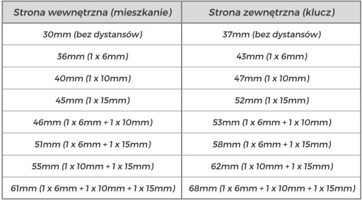 Wymiar wkładki C to regulowane 30mm-61mm od strony wewnętrznej mieszkania oraz również regulowane 37-68mm od strony zewnętrznej (od strony klucza).