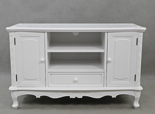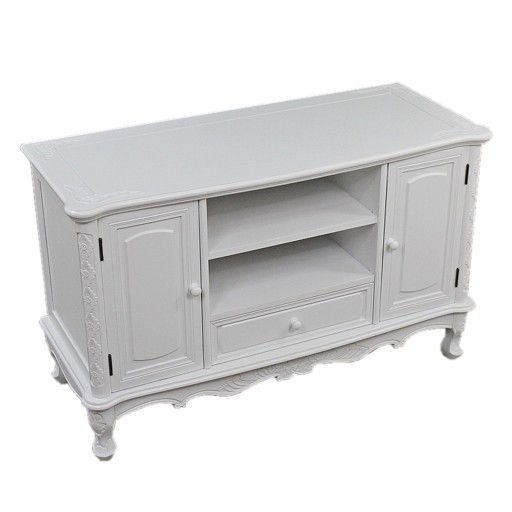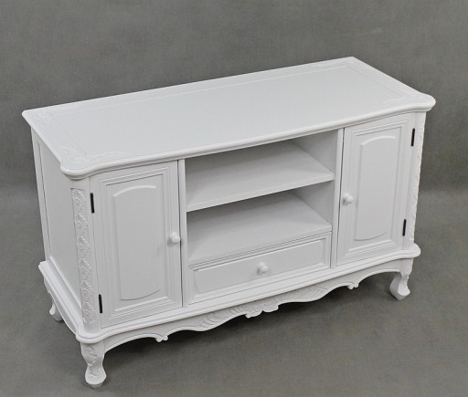 Urokliwy mebel z giętymi nogami oraz z przepięknymi rzeźbieniami. Posiada dwie szafki, półkę na sprzęt rtv oraz szufladę.