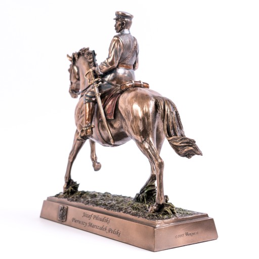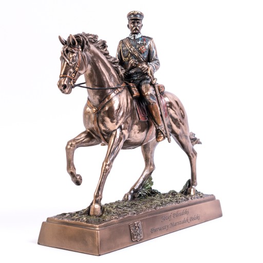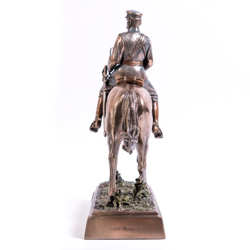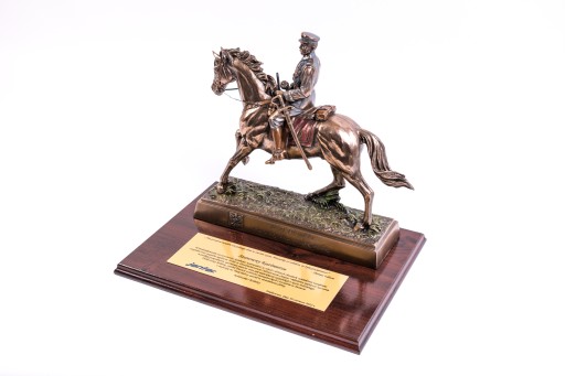 Figurka z kolekcji Veronese przedstawiająca postać marszałka Józefa Piłsudskiego na kasztance, w komplecie z tablo i dedykacją.