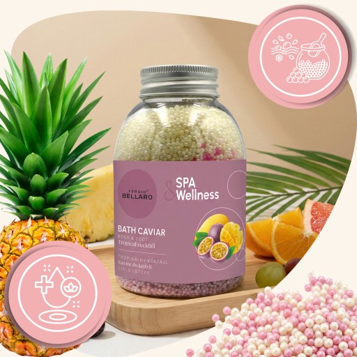 Zamień zwykłą kąpiel w relaksujący, tropikalny rytuał SPA. Perłowy kawior do kąpieli o smakowitym zapachu tropikalnego koktajlu owocowego delikatnie otula ciało, pomaga się odprężyć, regeneruje i nawilża skórę, dając chwilę prawdziwego luksusu – bez wychodzenia z domu. Perełki doskonale sprawdzą się nie tylko do kąpieli całego ciała, ale również do moczenia stóp i pięt, pomagając je zmiękczyć, wygładzić i zadbać o ich estetyczny wygląd.