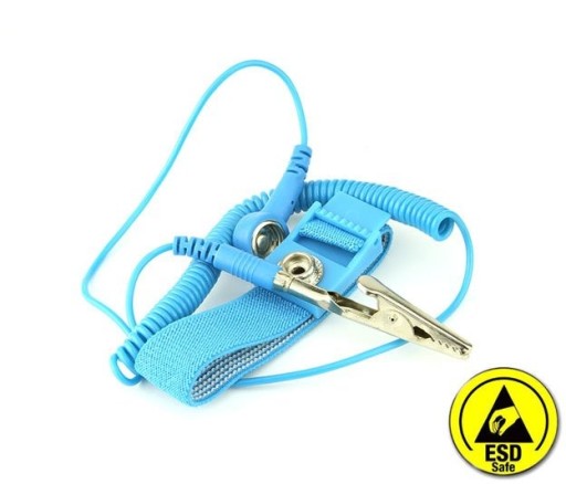 Antystatyczna opaska ESD na nadgarstek, w kolorze niebieskim. Przewód zakończony jest wtykiem bananowym z krokodylkiem. Opaska zabezpiecza przed przeskokiem ładunku elektrostatycznego i uszkodzeniem układów scalonych, modułów elektronicznych itd.