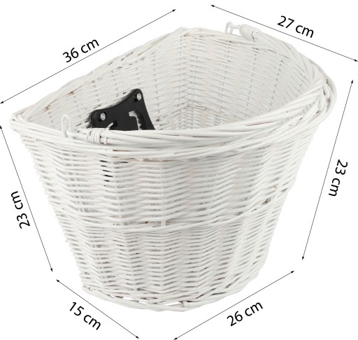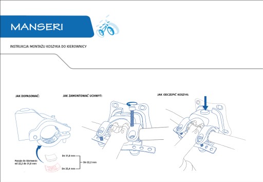 Montaż: do kierownicy montuje się uchwyt, do którego za pomocą przycisku przypinamy lub odpinamy koszyk.